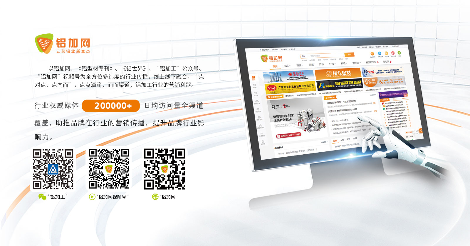 鋁加網(wǎng)(www.albiz.cn)是聞名鋁加工行業(yè)的垂直門戶網(wǎng)站,云聚鋁業(yè)新生態(tài),構(gòu)建鋁業(yè)新場景,以albiz.cn 網(wǎng)站為核心,以移動云端、鋁加工微信、鋁加網(wǎng)視頻號、《鋁型材專刊》和《鋁世界》雜志為載體,成為了鋁加工行業(yè)資訊和精準傳播的首選傳媒。鋁加網(wǎng),采集和發(fā)布全行業(yè)信息資訊,提供線上展覽、在線直播、短視頻、品牌策劃、品牌運營、品牌傳播等全方位的專業(yè)服務(wù)。